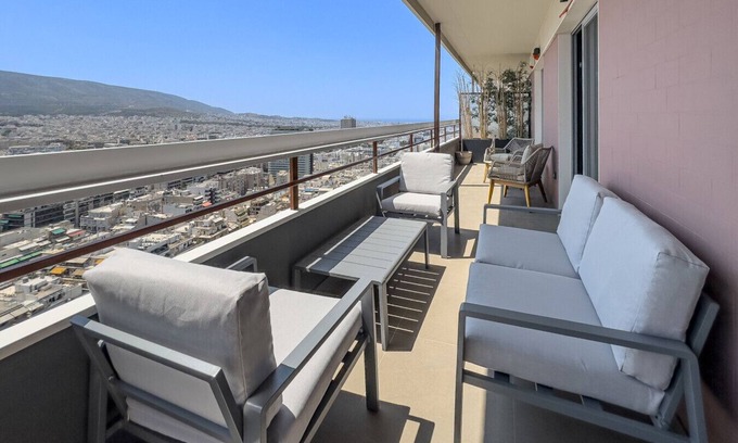 Welcome to Apollo Skyview Penthouse by Phaedrus Living, a stylish urban retreat perched on the 21st floor of the iconic Purgos Apollon building in central Athens. This elegant two-bedroom residence offers sweeping city views and a serene atmosphere, making it the perfect choice for families, friends, or business travelers seeking comfort and convenience. Spanning 130 square meters, the penthouse features two inviting bedrooms with queen-size beds, providing a restful escape after a day in the city. The large balcony is a true highlight, ideal for sipping your morning coffee or enjoying a glass of wine at sunset while taking in the expansive Athenian skyline. The residence includes a fully equipped kitchen, one en-suite bathroom, and an additional WC, all designed for comfort and functionality. With its modern interiors and panoramic views, the Apollon Skyview Penthouse combines style and practicality for a memorable stay. Centrally located, guests will enjoy easy access to key points of interest such as Ambelokipi Metro Station, Lycabettus Hill, and the vibrant neighborhoods of Kolonaki and Exarchia. The area is surrounded by cafés, restaurants, and local shops, offering a true taste of Athenian life. Experience the perfect blend of urban energy and tranquil comfort in the heart of Athens at Apollo Skyview Penthouse.