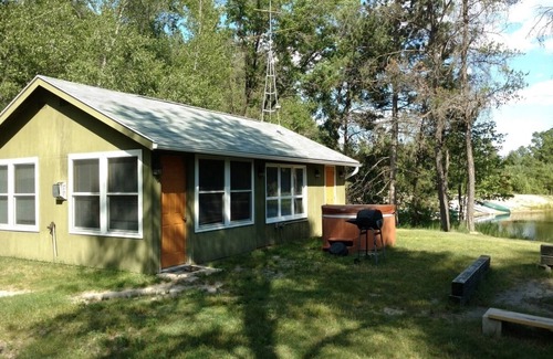 Pheasant Cottage is a 2-bedroom/1-bathroom custom home on a small, private lake and has its' own private entrance and the front gate stays locked at all times with only our guests and your guests having the access information making them even more private! Each home has it's own view, an out door hot tub (facing Serenity Lake!), your own fire pit and beach so you can swim and fish right from your cottage!! The bathroom is through the main bedroom. It has a double bed in the main bedroom, a double and a single bed in the second bedroom and a double futon in the living room and will have a double futon in the entry way for this on-season. (for some reason, it states that it has 6 beds in the heading. It has 4 (two double beds, a single bed and a double futon), not 6-we apologize for the confusion!)