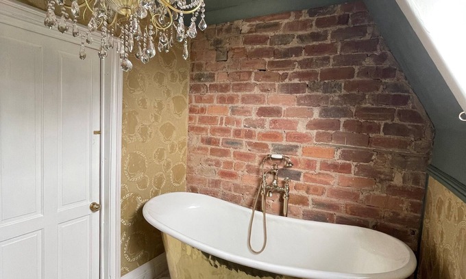 Through the further hallway you will find the bathroom. A luxury gold roll top bath is the centrepiece to this room with traditional taps and shower head. The perfect space to relax. The Versace wallpaper and exposed brick creates a hint of elegance and luxury along with marbles floors and counters. The dresser/vanity unit creates the perfect space for getting ready and the luxury art deco wall lights finish the space.