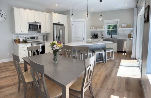 Our newly constructed home (2022) has four bedrooms, three bathrooms, and a fully equipped kitchen. Designed to comfortably sleep 12 guests, our open concept kitchen comes complete with dishes, cookware, and spices. There are also two separate living rooms, each with its own Smart TV for entertainment.