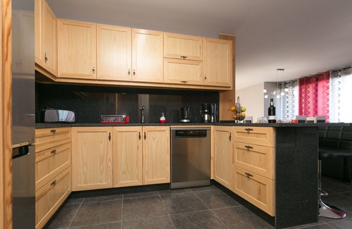 Equipped with oven, microwave, espresso machine, refrigerator / freezer, dishwasher, and kettle toaster.