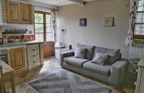It has a large twin bedroom with exposed stone walls and terracotta floor.