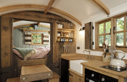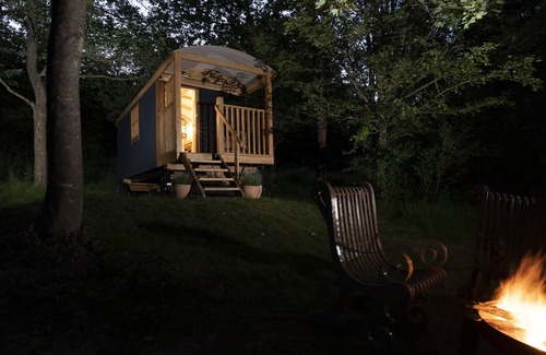 Pigeon Hole is a cosy Shepherds Hut nestled in woodland, with a view of the lake; ideal for a glamping experience.