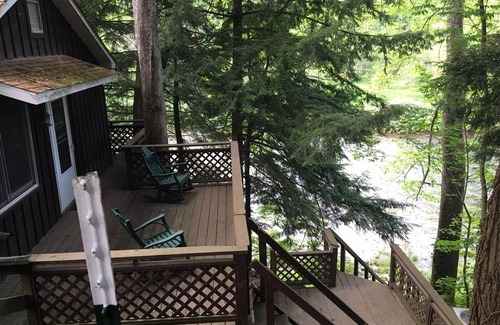 The cabin nestled in the tree tops with a screened deck over pine creek offers amazing views. While quaint in size it offers 2 bedrooms and 2 bathrooms. One bedroom has a queen size bed with an attached bathroom. The other bedroom has a double size bed, both have a television. There are 2 comfy couches in the living room with another bathroom. The kitchen has a full-size refrigerator, microwave, dishwasher, farm sink, full range. keurig duo coffee maker for both traditional and k-cup coffee.