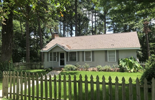 Fully furnished cottage in the woods with backyard opening to pine trees and four acre pond. Cottage has wood floors, window air conditioners and homey furnishings. Perfect for a family retreat or a romantic getaway. Located on our 50 acre working ranch, Pine Grove Cottage is tucked away on its own corner of the property with private drive and gated entrance. A sun room runs the length of the house in the back and looks out on the pine grove and lake beyond and serves as a third bedroom. An open family room/dining/kitchen is perfect for family gatherings. Guests are free to roam the ranch property which includes expanses of wooded acreage where wildlife and birds abound. Fishing on the lake is available on a "catch and release" basis to ensure fishing remains good for future guests. Lakes are stocked with bass, catfish and bream.