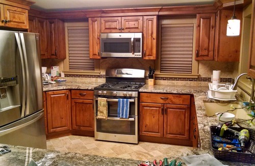 There are three bedrooms, two with queen-size beds and one with a full-size/twin bunk bed. There is also a queen-size pull-out sofa in the living room, bringing total sleeping capacity to 9.