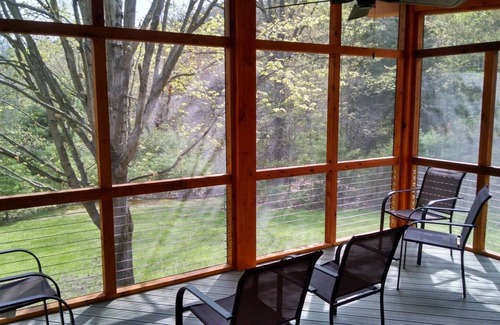 There is a large, screened-in porch, as well as an open deck facing the back of the property from which to enjoy the backyard and view of the mountains.