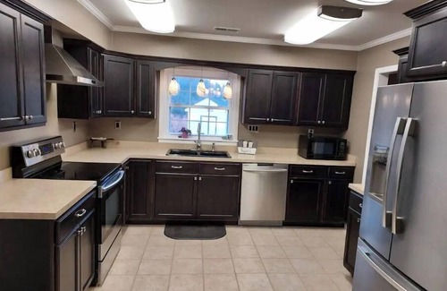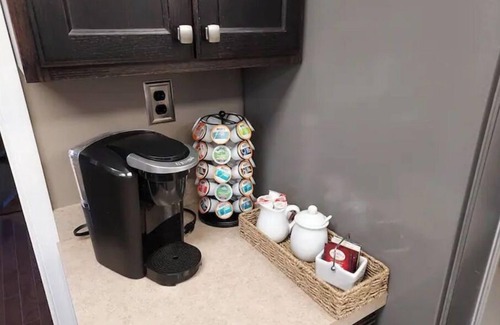 The kitchen is fully equipped including a dishwasher, toaster, coffee pot and Keurig with K-cups. The dining room is adjacent with a large table to gather around.