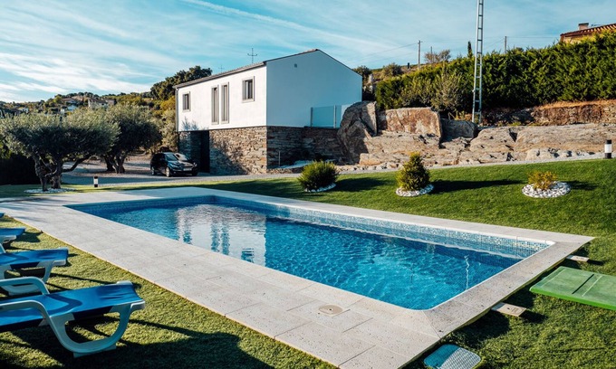A private pool with sun loungers for sunbathing in the sun of Portugal