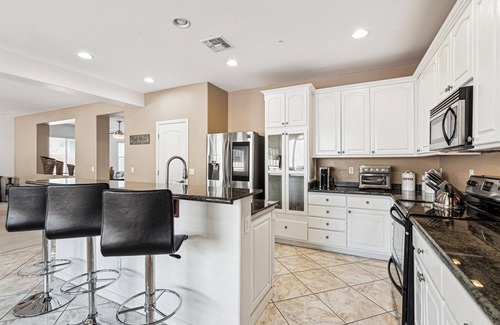 Pinnacle Breeze offers five thoughtfully designed bedrooms, each crafted for comfort and relaxation. The spacious primary suite features a queen bed, a Smart TV, a cozy chaise lounge, a walk-in closet, and an en-suite bathroom with a double vanity, soaking tub, and stand-in shower. The second bedroom also boasts a queen bed and a private en-suite bathroom for added convenience. Two additional bedrooms each offer a comfortable queen bed, while the fifth bedroom is perfect for extra guests, featuring a trundle bed with two twin beds and a dedicated workstation. With three bathrooms and a half bath, there's plenty of space for everyone to refresh and recharge.