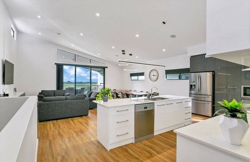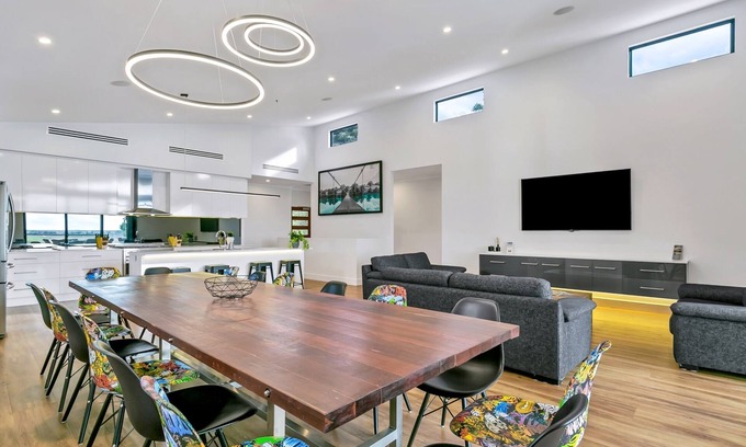 This open plan home has two living areas both equipped with comfortable lounges and LCD TV's and a dining table that comfortably seats 16 guests