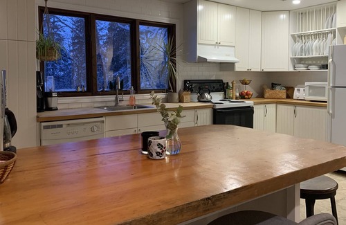 The main living space features a wall of windows overlooking a beautiful forest with access to a raised deck - great for star gazing or watching the groomers on the hill. Here you will also find a cozy fireplace for chilly nights and a dining area that seats 6-8 comfortably. The modern, well-equipped kitchen has everything you need to prepare a delicious meal and is anchored by an island for friends and family to gather around. Dishwasher and BBQ included.