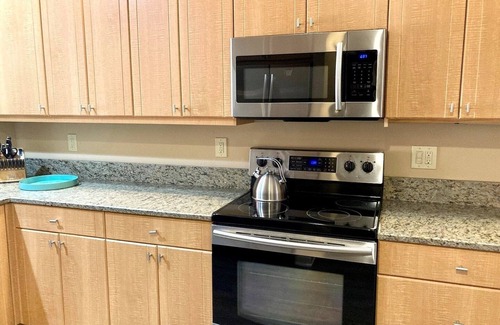 Prepare a home-cooked meal in the kitchen, complete with an oven, a refrigerator, and a dishwasher, as well as a coffee maker, a microwave, and a toaster. And you won't have to pack extra clothes, because you'll have a washer and dryer, too. Other amenities include an ironing board and air conditioning.