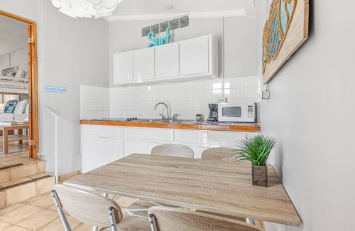 Once you enter Playita Rosada you are greeted with a charming rustic-style kitchen and dining table. The kitchen has a full-size fridge, stovetop, toaster, coffee maker, and microwave. It also has a convenient opening toward the dining room that sits 4 guests.