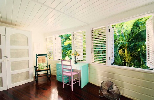 This Caribbean villa enjoys an open plan living and dining area with hardwood floors and louvre doors that open up onto the deck and an outdoor eating area. The kitchen, spacious and modern, is fully equipped, and with shutters that open out to valley views, keeps the place cool and bright. Wooden floors, crisp white walls and louvre windows all conspire to create a uniquely fresh Caribbean vibe.