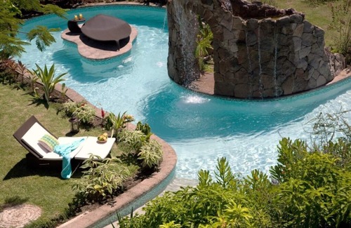 • A beautiful pool and water feature amid lush gardens.