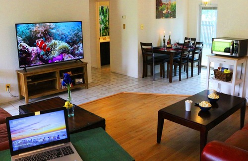 Suite A is on the ground floor and is handicap accessible. Perfectly located! Minutes from downtown Austin and from the airport. Shaded by three MASSIVE pecan trees, Pecan Place At Manor is your stylish, inviting, home away from home. Easy walking distance to lots of restaurants, parks (bocce!) even a small-town pool hall and of course Texas BBQ.