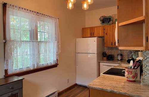 An exceptional lakefront vacation home, recently renovated with modern updates and amenities, while capturing cozy lake house charm. The exterior boasts beautiful natural fieldstone along with the family room, as well as the large living room gas fireplace. Original hardwood floors can be found on the first and second floors. The fully equipped kitchen has granite countertops and seating for 4, with seating for 8 in the family room dining area. A washer and dryer are located in the basement for your use. There is a retro mini-fridge on the side covered porch for your convenience. The family room and loft room have Sony Smart TVs serviced by DISH, and the house is equipped with WIFI. The upstairs loft-style bedroom has a hangout area for watching tv, reading, and shelves full of family- favorite board games!