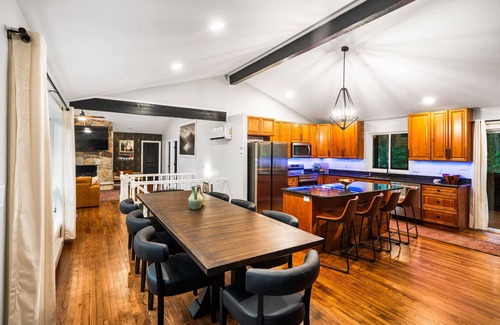 Escape to the Pocono Speakeasy, a 5BR 3.5BA retreat in Penn Estates. Enjoy a 1920s-themed bar lounge, golf simulator, arcade, movie room, hot tub, multiple decks, and open living spaces. Perfect for family fun or friends’ getaways, this stylish hideaway blends roaring twenties charm with modern comfort.