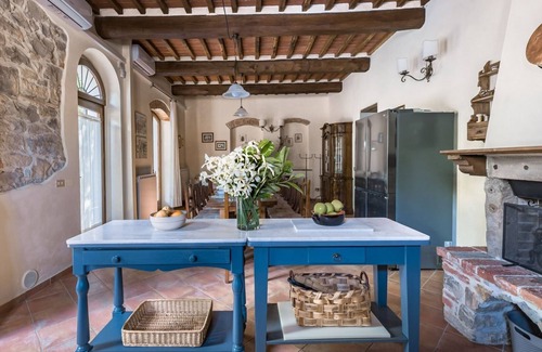 This large Tuscan property, located between Siena and Arezzo, is a good choice for a big get-together, made up of three apartments split between a spacious stone villa and a converted barn, just a few steps from each other. The well-maintained garden, furnished terraces and private pool offer uninterrupted views across hills and fields, with barely another building in sight. Between the two neighbouring properties, each with two storeys, there’s room for up to 13 people in 7 bedrooms, making this a suitable spot for large groups of families or friends to enjoy a secluded Tuscan break. The warm hue of terracotta tiles on the floors, comfortable sitting areas and several fireplaces will create a snug atmosphere on cooler evenings.