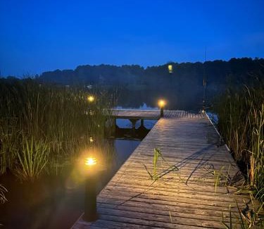POGO dom nad Narwią - 4 sypialnie, balia, własny pomost, plac zabaw is a recently renovated villa in Pogorzelec where guests can make the most of the private beach area and water sports. This beachfront property offers access to a balcony, free private parking, and free Wifi. On clear days, guests can head outside to enjoy the villa's outdoor fireplace or simply kick back and relax. Featuring a terrace and river views, the spacious villa includes 4 bedrooms, a living room, flat-screen TV, an equipped kitchen, and 2 bathrooms with a hot tub and a bidet. Towels and bed linen are available in the villa. There's also a seating area and a fireplace. For those times when you'd rather not eat out, you can cook on the barbecue. Guests at the villa will be able to enjoy activities in and around Pogorzelec, like fishing. A baby safety gate is also available at POGO dom nad Narwią - 4 sypialnie, balia, własny pomost, plac zabaw, while guests can also relax in the garden. Old Town Market Place is 28 miles from the accommodation, while Warsaw Uprising Monument is 28 miles from the property. Warsaw Modlin Airport is 22 miles away.