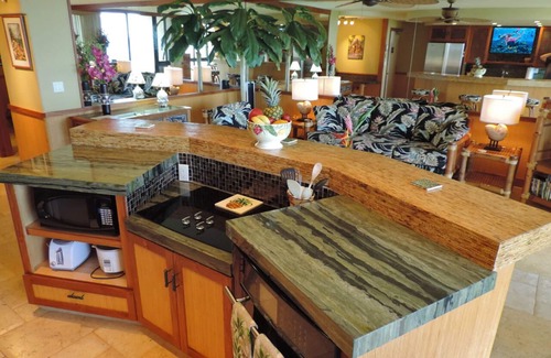 Our one bedroom, one bath, 865 square foot condo sleeps two people. Completely remodeled in Dec. 2007, it now has travertine tile through out, granite counter tops, stainless steel appliances and two HDTV's. It has been decorated with a tropical Hawaiian flair with unobstructed views from the living room, dining room, kitchen, and, of course, the lanai. Here you can enjoy the swaying palm trees, warm tropical breezes, and the most beautiful sunsets on earth. Features include a king-size bed and fully-equipped kitchen. We have tried to include everything possible to enhance your comfort and enjoyment.