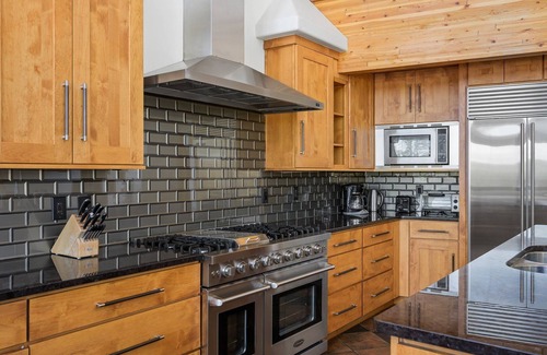 The fully equipped kitchen boasts modern appliances, including a refrigerator, stove/oven, dishwasher, and microwave, along with all the necessary dishes and utensils for your culinary adventures. Enjoy meals together at the dining table or take them outside to the deck for al fresco dining with breathtaking mountain views.