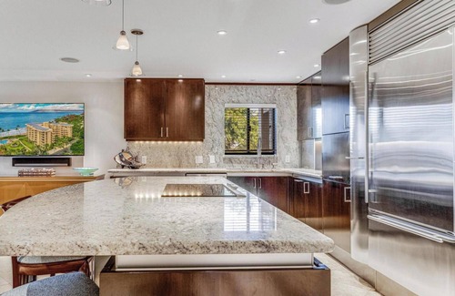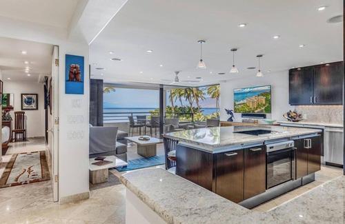 Polo Beach Club 408 is a stunningly renovated vacation rental that offers breathtaking ocean views, making it an ideal getaway. Guests can relax on the lanai, enjoying the sight and sound of turquoise waters gently lapping the shores of the serene Polo Beach, conveniently located near the Wailea Beach Walk.