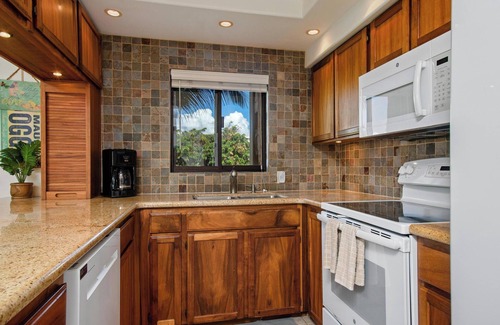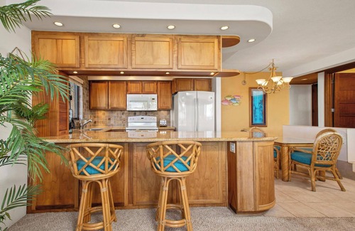 The interior of Polo Beach Club 508 is tastefully decorated, featuring tropical furnishings that will serve as a constant reminder that you are vacationing in the Hawaiian Islands. The open-concept layout encourages socializing and enhances the spacious feel. The fully equipped kitchen includes high-end appliances, allowing guests to prepare meals while enjoying the ocean views. Gather around the kitchen island for breakfast snacks as you plan your Maui iteneray for the day. The living area is designed for relaxation, complete with a large 52" flat-screen TV and comfortable seating. Each bedroom features plush bedding, ensuring a restful night\'s sleep, while the bathrooms are well-appointed with modern fixtures.