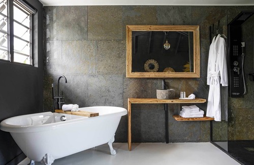 While you're here, you can enjoy all the comforts of home and more, including a soaking tub and an outdoor hot tub, as well as a rainfall showerhead and a refrigerator. Other amenities include designer toiletries, premium bedding, a Select Comfort bed, and pay movies.