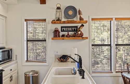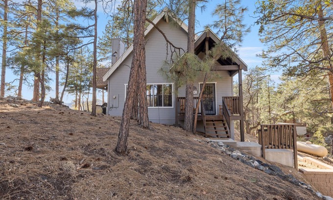 This Prescott cabin boasts 3 inviting bedrooms, including 1 King beds, 1 Queen bed, 1 full bed, and 1 bunk bed. Nestled in the serene and secluded setting of a full acre of Ponderosa pines in the Prescott National Forest with mountain views, guests can unwind in the peaceful surroundings and enjoy the charming decor throughout. With modern amenities like WiFi, AC, and flat screen TVs, new gas fireplace, along with cozy touches like a hair dryer, a hot tub on the lower of two decks, fire pit, horse shoe pit, and a recently resurfaced pool table in the loft, your stay will be comfortable and relaxing. You're sure to make fantastic memories with a stay at our place. Property is frequently visited by herd of deer that beds down in the adjacent forest.