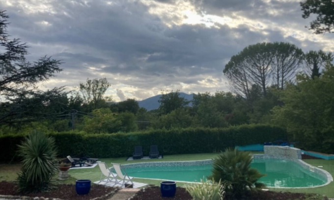 The Living Room has a double lounge with fireplace area equipped with sofa bed , the other half with sofa, armchairs and smart television (Netflix), wifi throughout the house, heating and AC.Pool view.