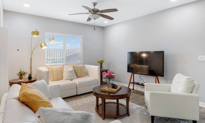 Leyla is a bright and modern retreat perfectly designed for comfort and convenience. Inside, you'll find a light-filled living area with plush seating, a flat-screen TV, and a laid-back yet elevated vibe. The fully equipped kitchen features modern appliances, making meal prep a breeze, while the dining area comfortably seats four. Whether you're cooking a homemade meal or grabbing takeout from a nearby hotspot, this space is perfect for gathering and enjoying your time together.