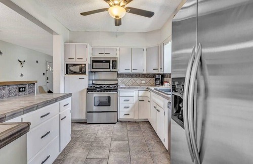 Welcome to our charming industrial farmhouse, where the blend of exposed piping, vintage lighting, and rustic décor creates a unique ambiance that pays homage to San Antonio's rich history. This 3-bedroom, 2-bathroom home is bathed in natural light, offering a master bedroom with a king bed, a second bedroom with a queen bed, and a third walk-through bedroom with two queen beds. The spacious living area boasts ample seating, including a queen-size pull-out sleeper sofa and two plush chairs, and a 50" SmartTV. The fully equipped kitchen is perfect for home-cooked meals, but with a variety of nearby restaurants, takeout is also a convenient option to enjoy on the private backyard patio with a pool. Experience year-round enjoyment in the backyard, whether lounging on the deck, seeking shade under mature trees, or taking a refreshing dip in the pool.