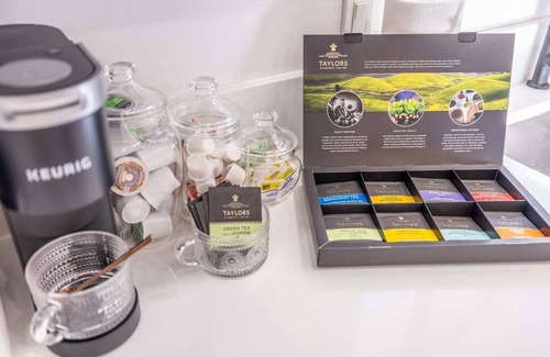 ✓ Keurig machine with complimentary coffee pods, plus a selection of Taylors teas