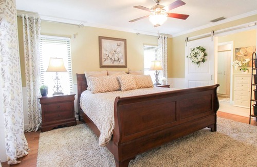 Your master oasis awaits! This large room boasts a king-size bed and plenty of space to unwind after a long day of adventure. Through the sliding barn-style doors, you will find the master bathroom. This space has two separate vanities and a large walk-in shower that is tiled from floor to ceiling.