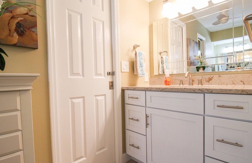The family room, located at the back of the house is the perfect spot to hang out after hanging by the pool all day. Boasting a large “L” shaped couch and a Smart TV for you to watch all your favorite shows. The second bedroom located down has a queen-size bed, a couch, a Smart TV, and plenty of space for your belongings. The second bathroom has a large vanity and a shower/tub combo with a detachable showerhead. The third bedroom has a king-size bed and plenty of closet space.