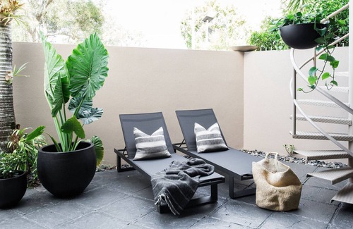 The two bedrooms have 5-star resort-style beds with luxurious bedding, and the master suite has a king-size bed and ensuite, with its own private courtyard encasing the Villa bedrooms downstairs. There are two bathrooms and a laundry.