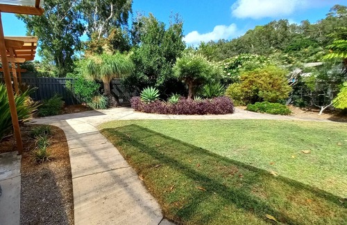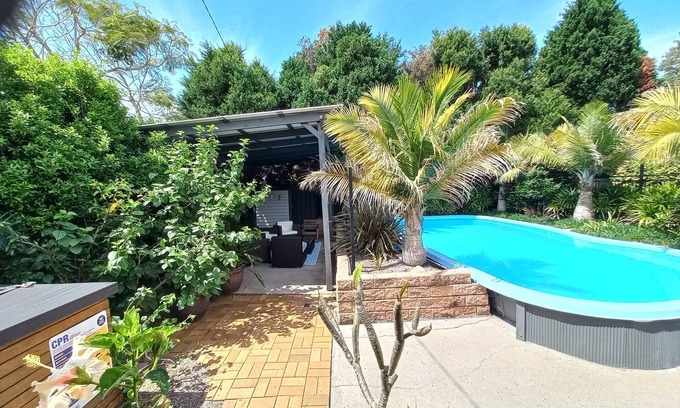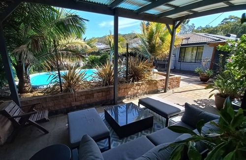 We have been hosting guests for over 10years with a 5 star rating on other property hosting platforms. This very private property is an easy walk or bike ride along paved paths to either, so take your pick! Or explore the three more secluded beaches of Zenith, Wreck, or Box Beach in between. Just steps away from the newly upgraded Tomaree walk. This recently renovated four bedroom, two bathroom home offers three bedrooms and two living areas in the main, plus an added queensland room featuring a sunroom and fourth bedroom where you can hear the waves of Fingal Bay at night. The 8m pool contains a shaded entertaining area, a shower, surrounded by tropical gardens, and overlooked by the fully equipped kitchen. Enjoy the comfort of ducted air conditioning (and heating) throughout, or open the doors and windows for beautiful sea breezes. There are four covered areas for shelter on rainy days, including a large, outdoor, covered, entertaining area looking onto the landscaped backyard - perfect for enjoying breakfast outside or a BBQ on a summer afternoon.The backyard features concrete walking paths to wander through the native garden or for the little ones to safely ride trikes and scooters.There are no steps in this home or leading to or from the home, and the main washroom contains supportive rails, making this property a good option for less mobile friends and family members. This property is fully fenced, so you can secure the boat, bikes, cars, and little ones. There is a laundry room with washing machine and sink, with direct access to an outdoor clothesline. Bedrooms: *Master bedroom: Queen bed, built-in robe, dresser, side tables, ensuite with shower, ceiling fan. *Bedroom 2: Single bed, double bed, side tables, dresser, ceiling fan *Bedroom 3: Queen bed, side tables, robe, ceiling fan. *Bedroom 4: Queen bed, dresser, side tables (plus private entrance and sunroom with pool view). Split air conditioning / heating system in room. All rooms contain 4x pillows, doonas, and mattress protectors, (sheets, towels, and pillowcases not included)