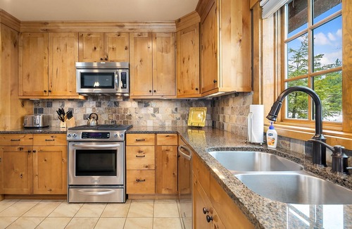 From the moment you walk in the door you’ll feel right at home in this luxurious two bedroom condo. The main living area boasts a full, granite kitchen with stainless appliances and a gas cooktop. There’s seating for 6 at the dining table which offers views of the pool. The comfortable couches and chairs offer a relaxing spot to watch your favorite show or just warm up around the cozy gas fireplace.
