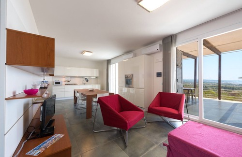 The villa offers three double and one single bedrooms, as well as two bathrooms with showers. The large living and dining area with open kitchen opens onto the shaded terrace with fantastic sea views and has a single sofa bed, so the house can comfortably accommodate up to eight guests.