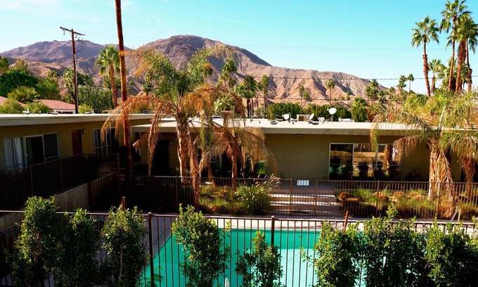 WALK down to the PASEO. This is the first time on the vacation-rental market for this large mid-century condo (over 900 square feet with private patio space, and sliding doors that open onto a HEATED pool. This apartment/home is part of a small complex with views the mountains. . It can accommodate 4. or more , if the sofas in the living room and bedroom are employed. A contemporary futon sofa in the living room is full sized.