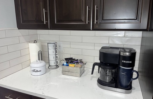The home's entry level includes a large great room, a kitchen & dining area, the first of two primary bedrooms (one on the main level and one upstairs), a guest bedroom, two bathrooms, and a bonus laundry with full size appliances. Enjoy a 65" 4K Smart TV and Blu-ray player in the living room. You will love the incredible views from the large patio, which includes additional dining seating and a gas grill for your delicious BBQ dinners. The classic kitchen is fully equipped with everything you need to make and serve your meals. Beautiful quartz counter tops and stainless steel appliances, plus seating for 12. The first floor primary bedroom has a California King bed and the en-suite bathroom has a double vanity and large walk-in shower. Both the first floor and second floor primary bedrooms have 55" 4K Smart TV’s. The first floor guest bedroom provides additional adult accommodations with another comfortable California King bed and a 32” TV. The adjoining bathroom doubles as a guest bathroom.