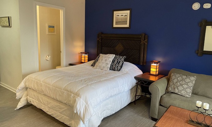 One bedroom with queen bed, ¾ bathroom. Small kitchenette with mini fridge, microwave, coffee pot and sink, minimal dishware. French doors open to outside deck area above pool. Sleeps up to 4.