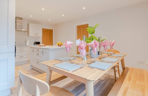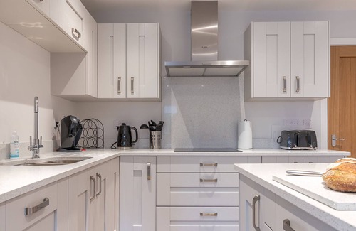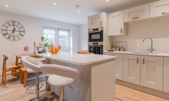Poplar House has a fabulous and spacious, fully equipped kitchen with sparkling white units and Corian work surfaces. At the centre is an island with two bar stools which is surrounded by all the appliances you would expect in a luxury rental including a double oven, with integrated microwave, a large fridge and freezer, dishwasher, Nescafe Dolce Gusto coffee machine, double sink and all the utensils, china and glassware required to cook at home or have caterers come in.