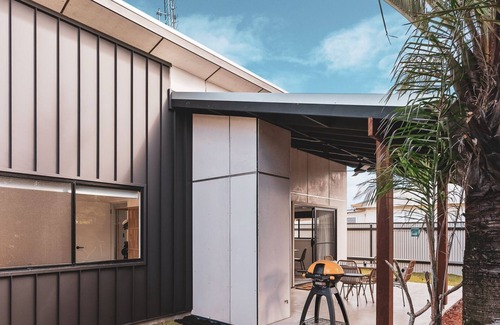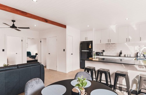 Perfectly positioned in the heart of town and a stones throw to the Beach and River. This brand new architecturally designed, ultra-modern two-bedroom villa, is the perfect holiday destination. Hand selected quality furnishings have been used to bring warmth and comfort to the modern interior, with polished concrete floors and up market finishes including King Beds. All this has successfully created a luxurious and private, relaxed coastal vibe. The enclosed yard enhanced with well-established palms and trees provides shade and a number of outdoor relaxation areas to enjoy a game of quoits or relax on an outdoor lounge. Poplar Villa will comfortably accommodate 4 guests and is available to book as 2 bedroom Villa, or book together with adjoining sister property, The Shack (that sleeps 10)