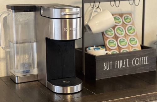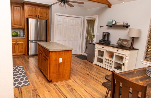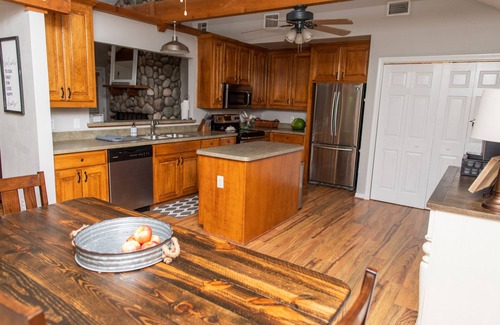 As you step inside, you'll be greeted by a well appointed kitchen and adjacent dining area. The fully equipped kitchen features all the necessities, allowing you to prepare delicious meals during your stay. We provide a Keurig coffee maker, crockpot, blender, mixer, assorted bakeware, and a plethora of cooking utensils. The kitchen is also equipped with a stove, microwave and a refrigerator, plus an additional small fridge for beverages and there is plenty of seating at the dining table for 7 people.