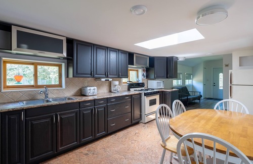 Recently renovated 2-bedroom cottage gives you plenty of space for the family inside as well as a massive amount of space in the double-wide lot outside! Plenty of room for Volley Ball / Badminton and other activities. There is a large firepit and a swing set located on one end of the lot, as well as a covered deck to stay outside but out of the sun to cool down!