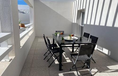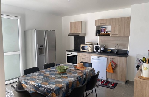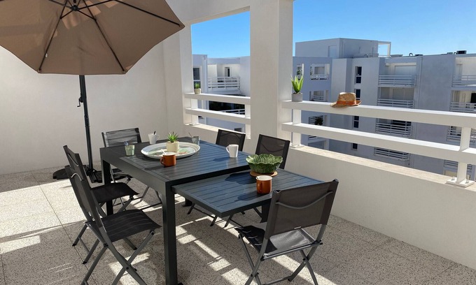 Les Voiles Blanches Residence. Beautiful 4-room duplex apartment with air conditioning in all rooms, located on the 3rd and top floor of a new luxury residence. Ideal for 6 to 8 people. East facing. 400m from the beach. Modern comfort and quality amenities. Spacious living room (sofa bed, TV) with access to an east-facing terrace (griddle), very well-equipped kitchen area (dishwasher, oven, large refrigerator/freezer, etc.), 1 air-conditioned master bedroom (1 double bed, storage) adjoining the terrace & a shower room (washing machine), separate toilet.