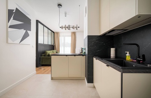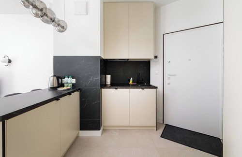 Port Praski Superior Apartment features a stylishly furnished living room with a sofa bed and kitchenette, a separate sleeping area with a comfortable double bed, and a bathroom. Guests have access to a range of practical amenities, including free WiFi, a TV with access to Netflix and Amazon, a washing machine, iron, hairdryer, fridge with freezer, dishwasher, induction hob, toaster, kettle, and kitchenware.